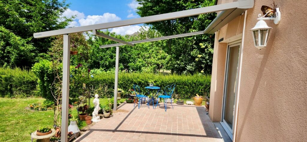 Une magnifique pergostore grise, alliant design moderne et fonctionnalité.