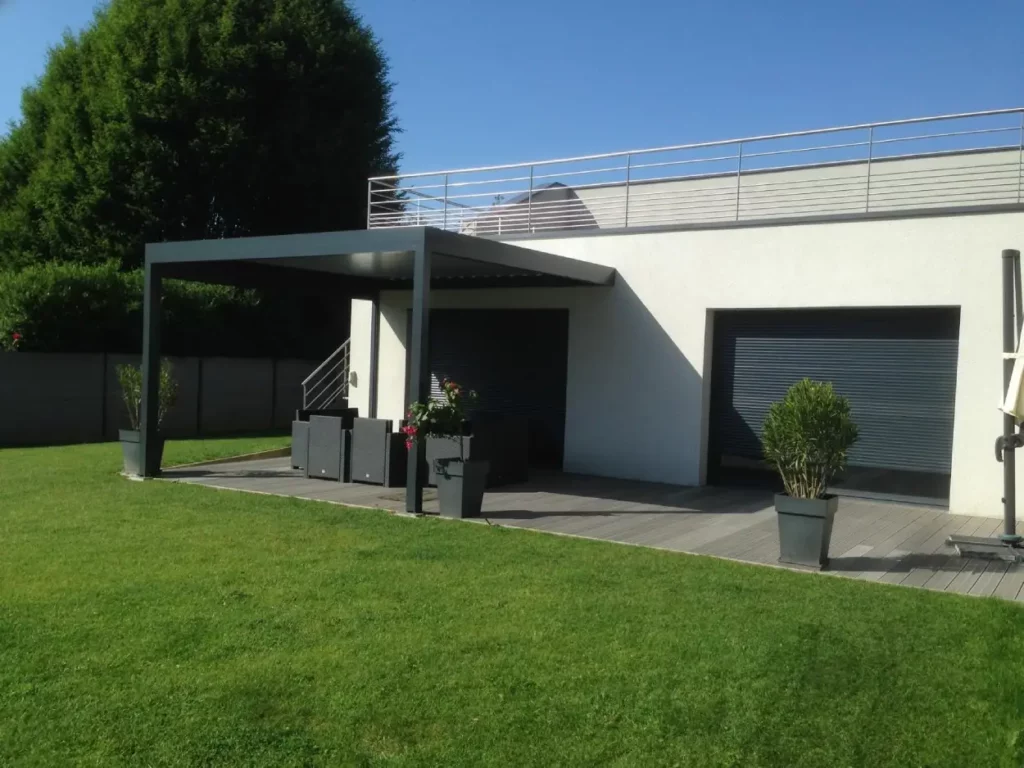 Une pergola bioclimatique adossée à cette grande maison au style moderne !