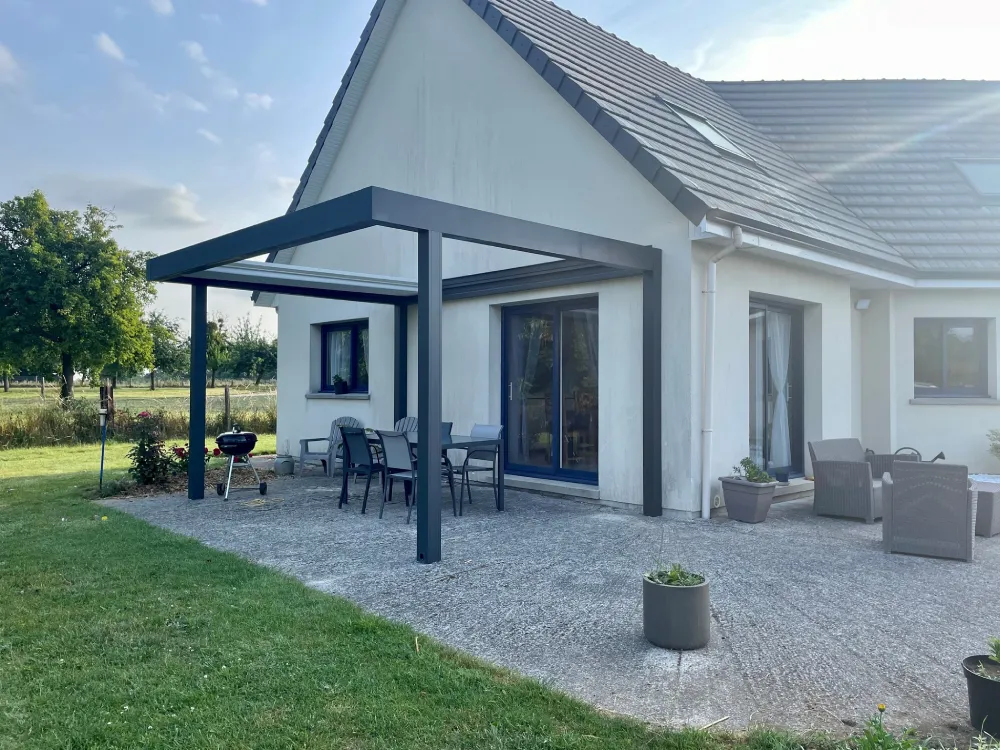 Découvrez notre réalisation à Blainville-Crevon : une pergola à toile rétractable, poteaux déportés ainsi que des lumières LED, complétant parfaitement une maison moderne.